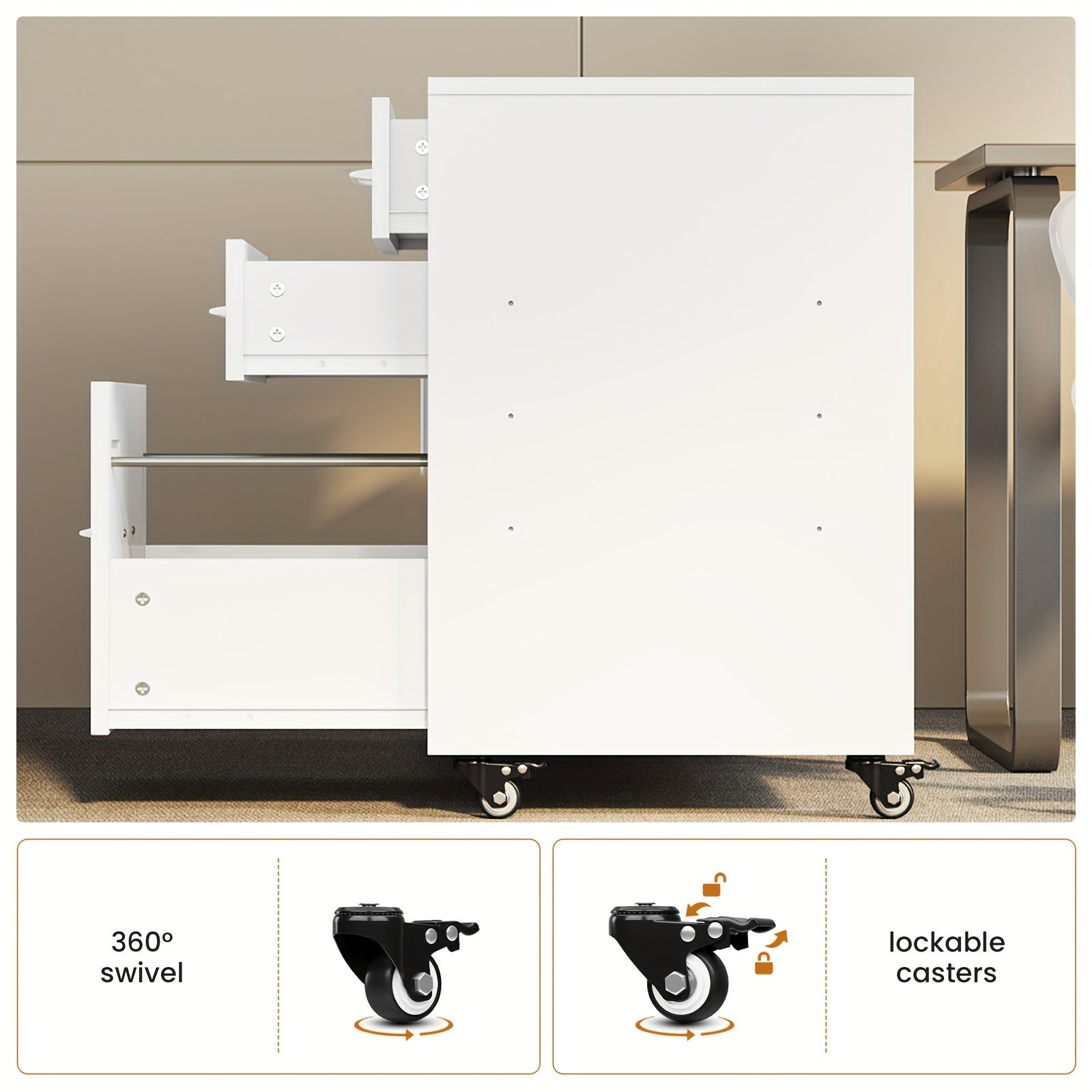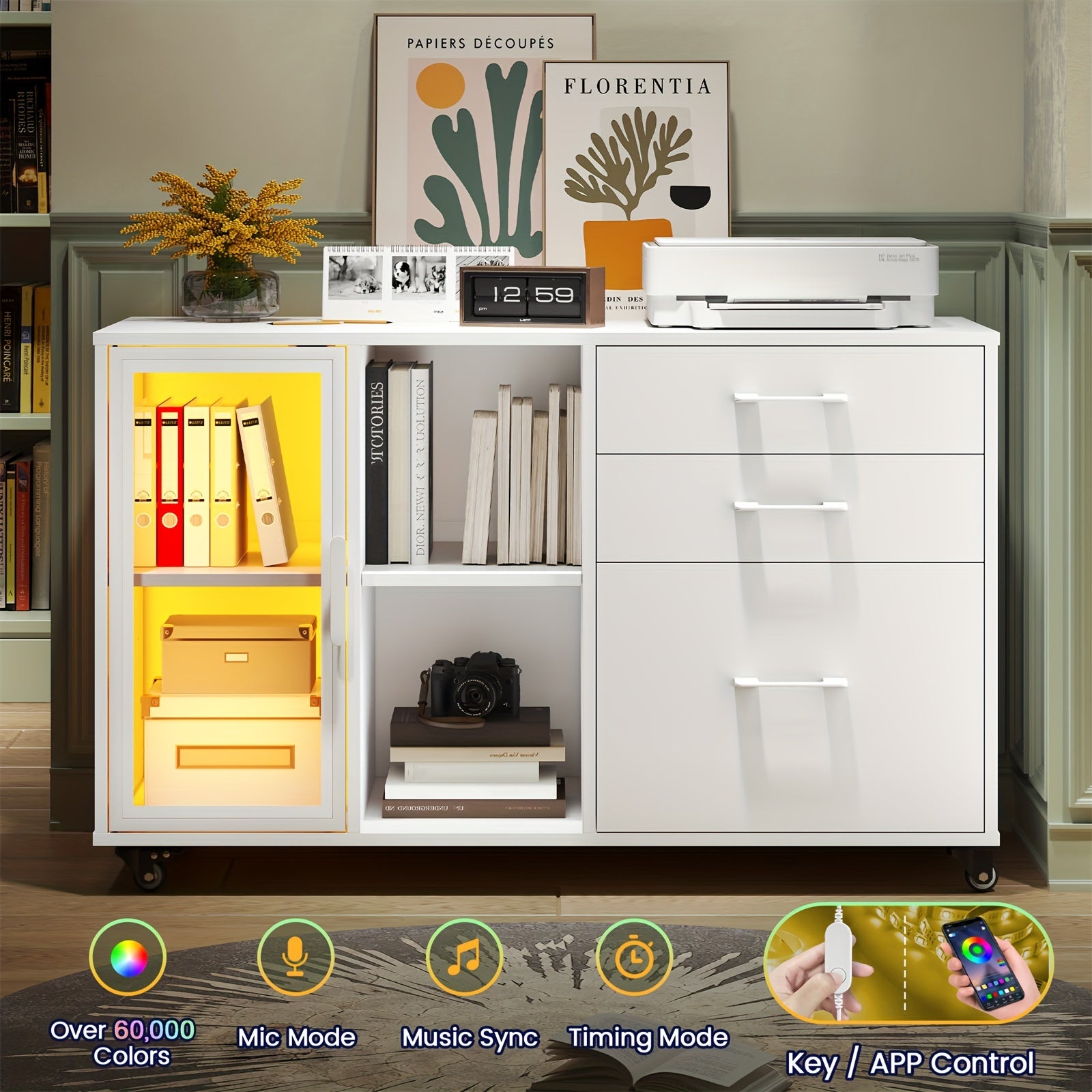 Three Drawer Rolling File Cabinet w/ LED Lights & Open Storage Shelves
