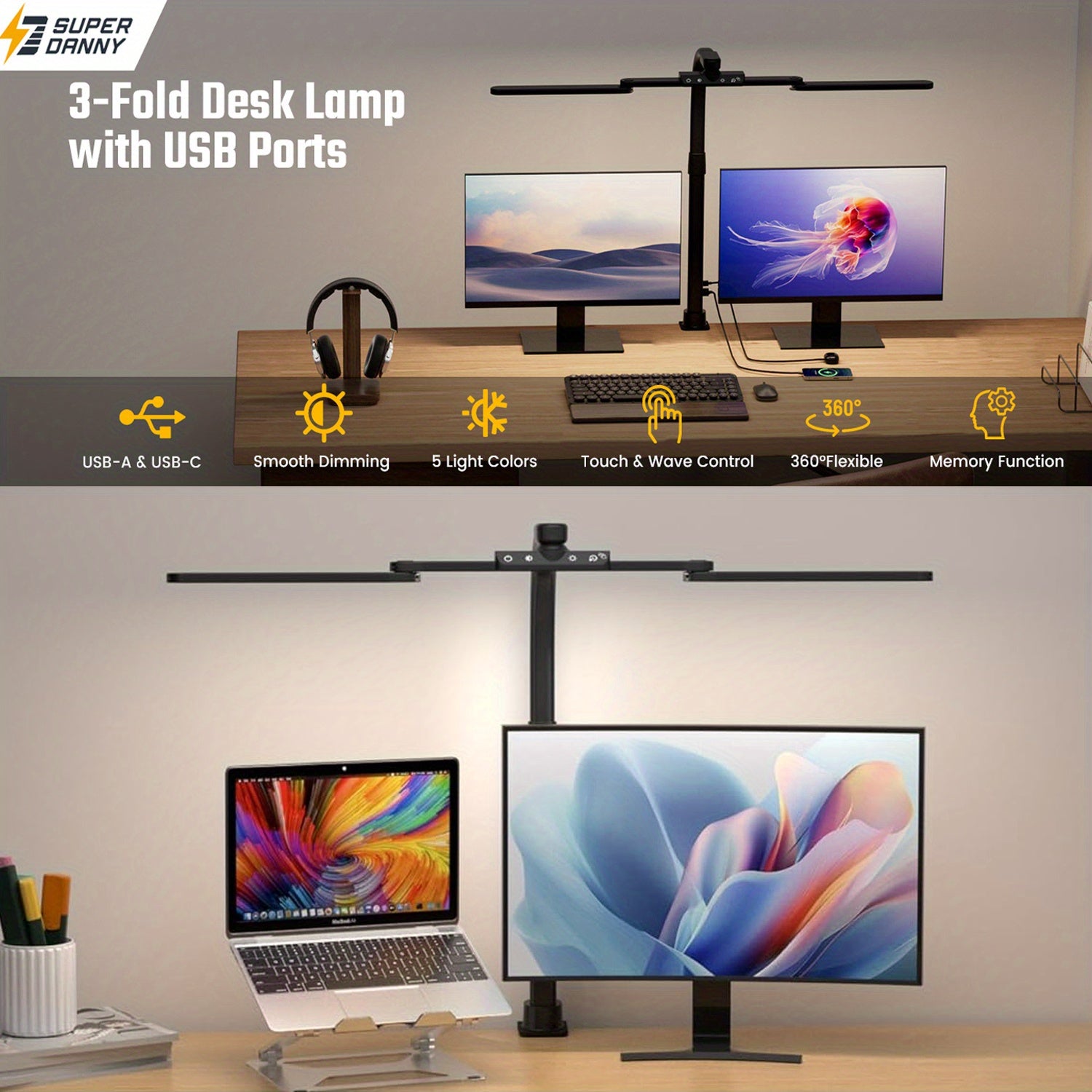 3-FOLD LAMP HEAD: This Desk Clamp Light features three adjustable lamp heads that provide customizable lighting to meet your needs. The side lamps can fold up to 270° to accommodate your screen setup, ensuring no direct light shines into your eyes.